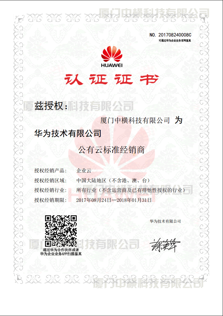 縱橫數據(廈門中橫科技有限公司)成為華為技術有限公司 公有云渠道標準經銷商。